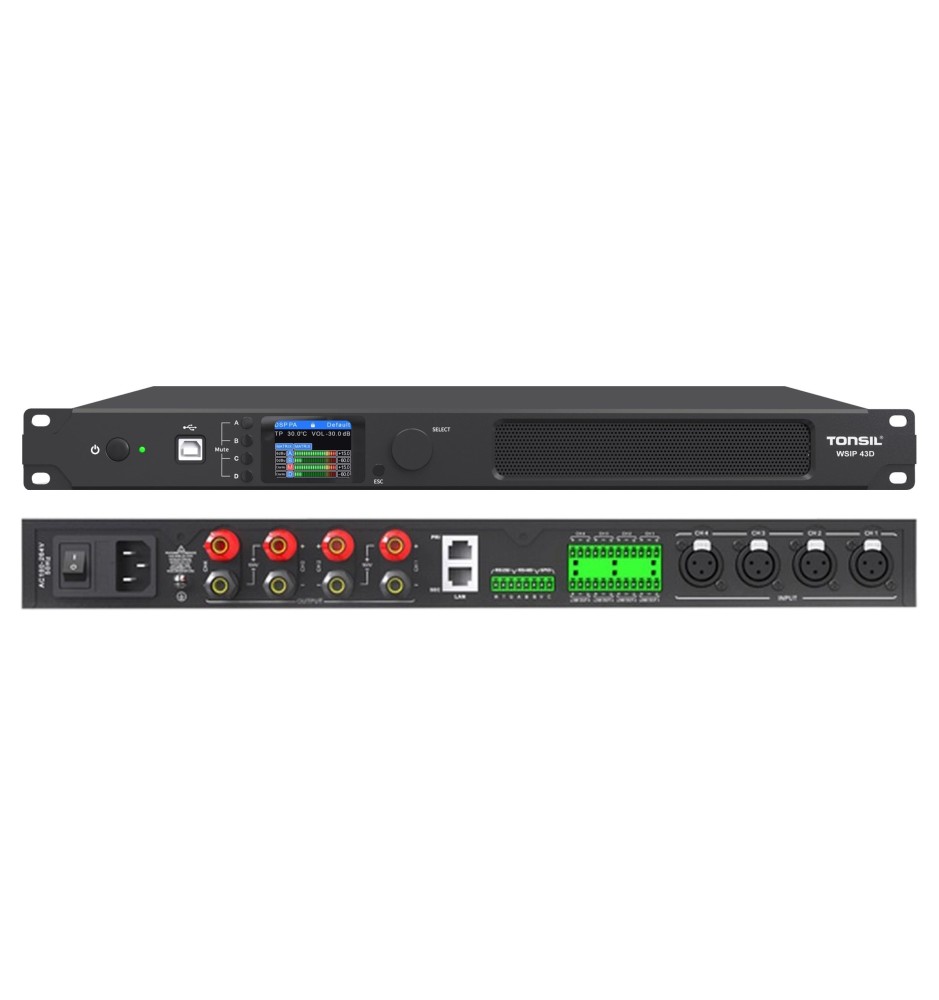 Tonsil WSIP 43D to profesjonalny 4-kanałowy wzmacniacz sieciowy o mocy 4x300W przy 8Ω i 4x450W przy 4Ω, wyposażony w cyfrowy procesor DSP i obsługę systemu 70/100V.