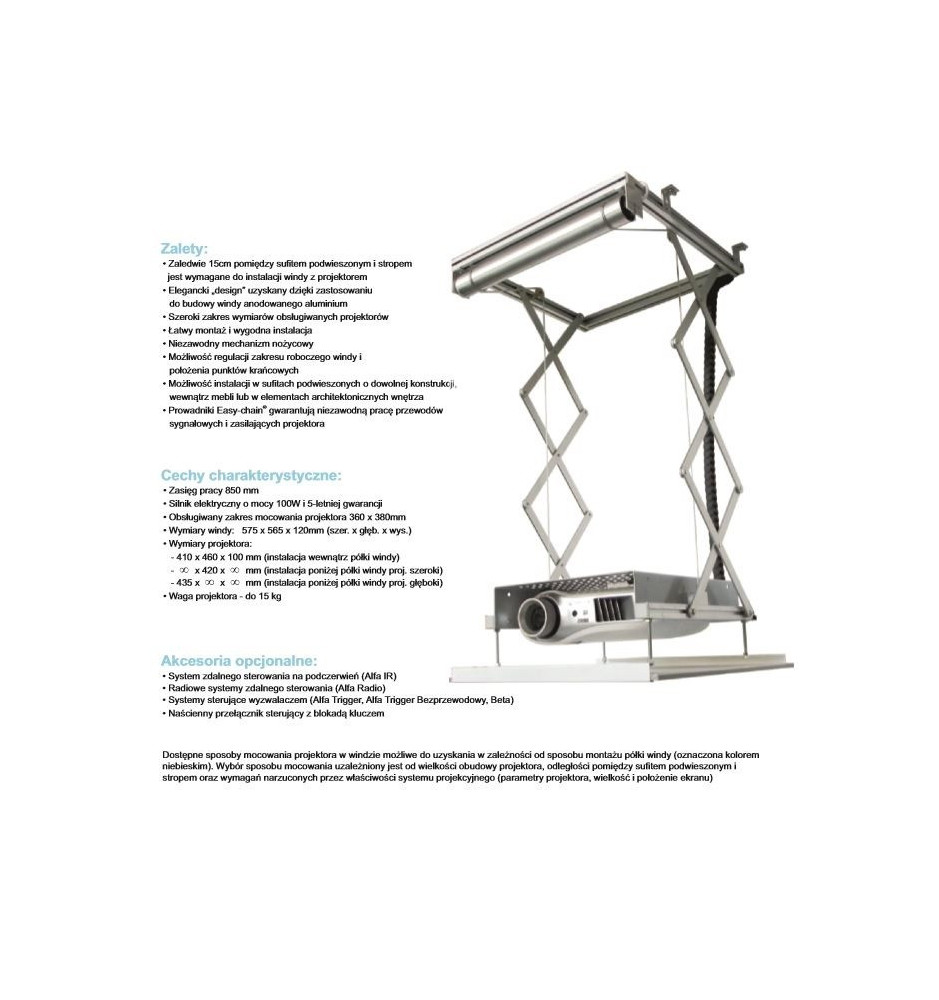 Przy pełnym złożeniu winda jest niewidocznie umieszczona w suficie modułowym. Dzięki swoim wymiarom oraz wadze jest idealna do każdej sali projekcyjnej, konferencyjnej lub lekcyjnej.