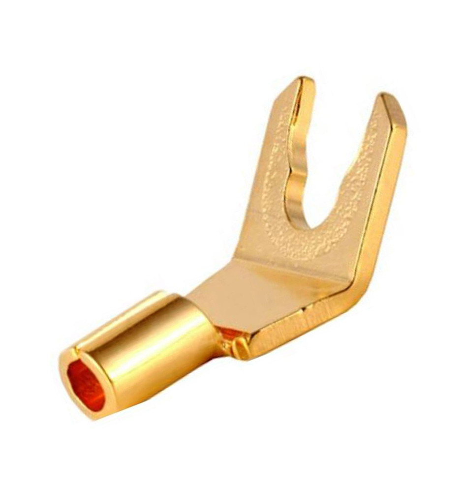 Wtyk typu widłowego wykonany z wysokiej czystości miedzi beztlenowej (OFC). Przeznaczone do montażu zaciskowego.
