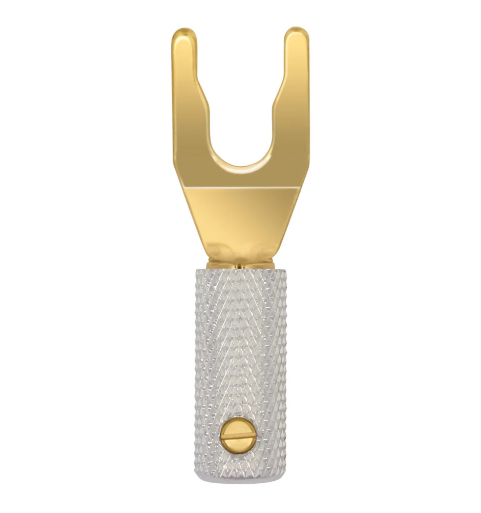 Pozłacany wtyk głośnikowy typu widełki z systemem Uni-Term™, umożliwiającym łatwą wymianę samego wtyku. Do wtyku dołączone jest gniazdo mocujące ze śrubą zaciskową, dzięki czemu może zostać przymocowany do przewodu poprzez lutowanie lub zaciśnięcie śruby. Wtyki Uni-Term™ stanowią standardowe wyposażenie wszystkich kabli głośnikowych WireWorld.