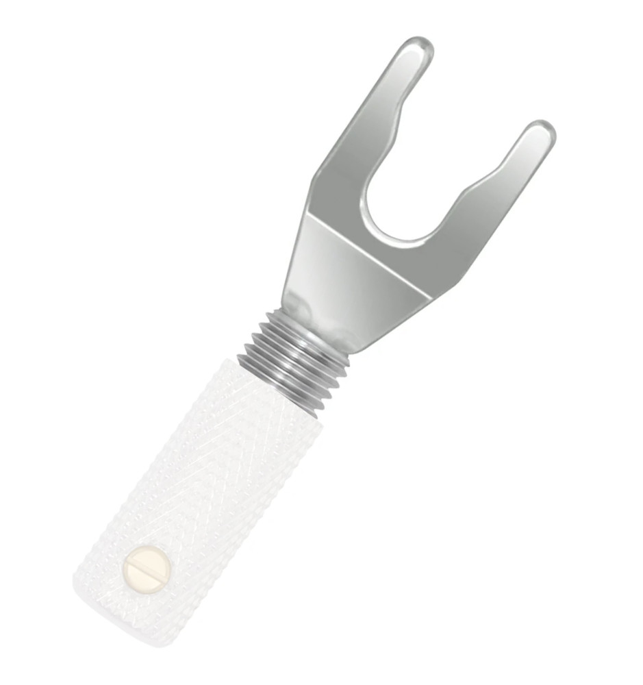 Posrebrzany wtyk głośnikowy typu widełki dedykowany do systemu mocowania Uni-Term™, umożliwiającego łatwą wymianę samego wtyku.