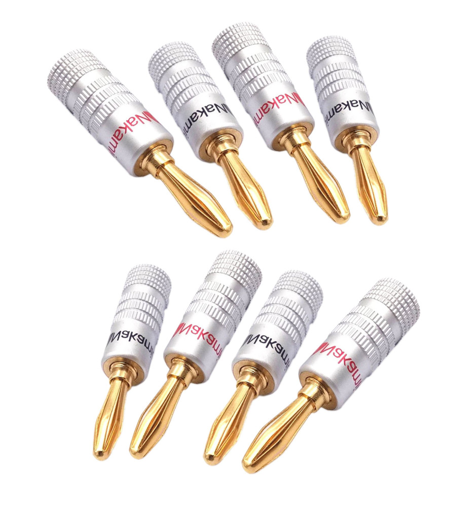 Najwyższej jakości wtyki bananowe typu sprężynka. Wykonane z miedzi beztlenowej OFC oraz platerowane 24 karatowym złotem, co zapewnia najlepszą jakość sygnału. Dzięki pozłacaniu, wtyczki zabezpieczone są przeciw utlenianiu się, a straty powstające na połączeniu są zniwelowane.