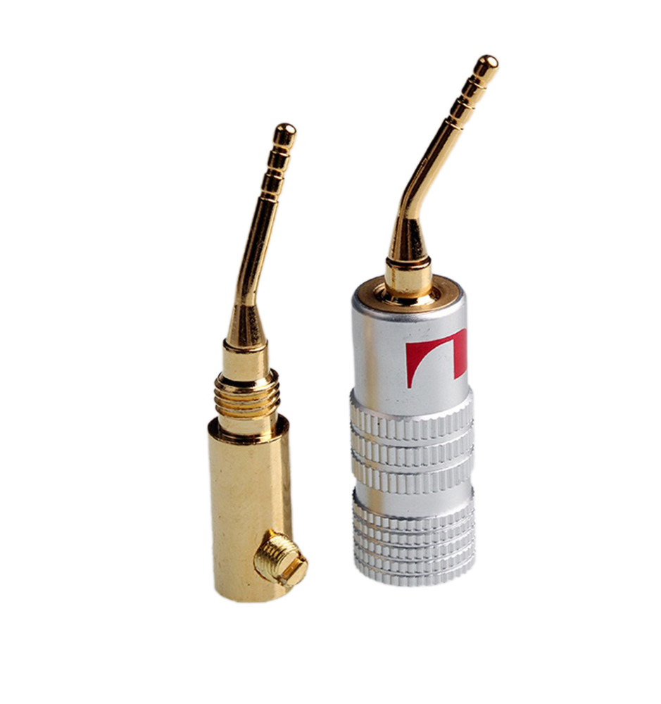 Najwyższej jakości wtyki bananowe typu szpilka. Wykonane z miedzi beztlenowej OFC oraz platerowane 24 karatowym złotem, co zapewnia najlepszą jakość sygnału. Dzięki pozłacaniu, wtyczki zabezpieczone są przeciw utlenianiu się, a straty powstające na połączeniu są zniwelowane.
