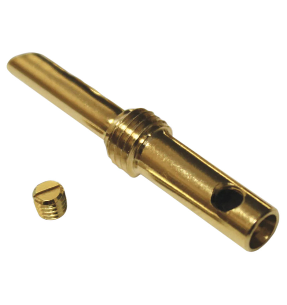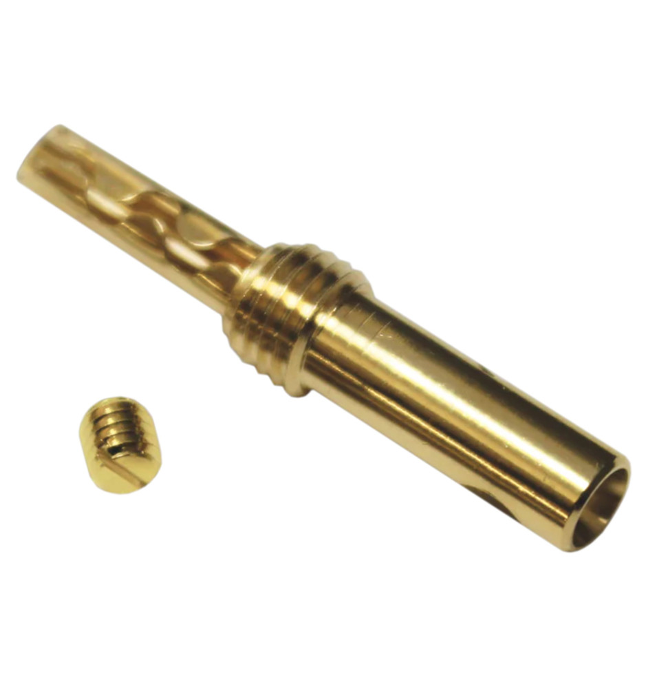 Pozłacany wtyk głośnikowy typu banan dedykowany do przewodów 10 AWG. Wtyk jest sprzedawany bez obudowy. W zestawie znajduje się: wtyk bananowy oraz śruba zaciskowa.