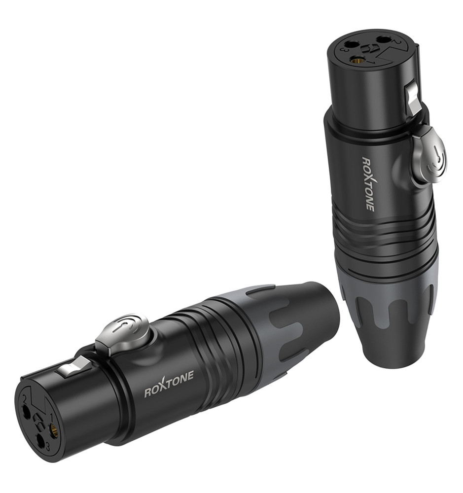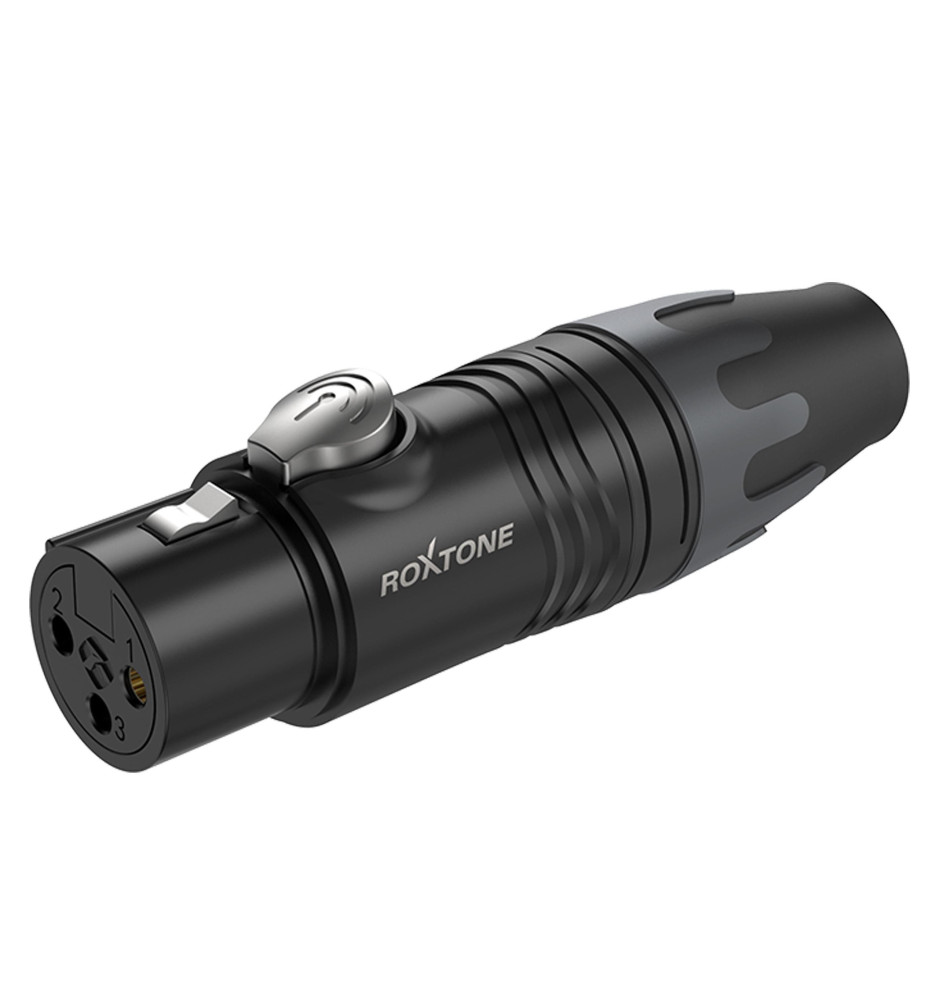 Wtyk mikrofonowy XLR marki Roxtone o wytrzymałej i ergonomicznej konstrukcji z powłoką ze stopu cynku. Dedykowany jest do montażu nakablowego z przewodami o średnicy od 3 do 7 mm.