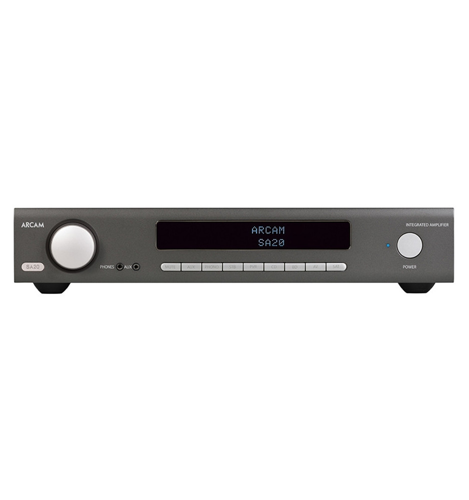 Na przednim panelu wzmacniacza zintegrowanego Arcam SA20 znajduje się pokrętło do regulacji głośności, włącznik, przycisk służący do wyciszenia, szereg przycisków służących do przełączania wybranego źródła dźwięku, wyjście słuchawkowe oraz wejście AUX. Liczne wejścia analogowe pozwalają na podłączenie do wzmacniacza SA20 praktycznie każdego źródła dźwięku.