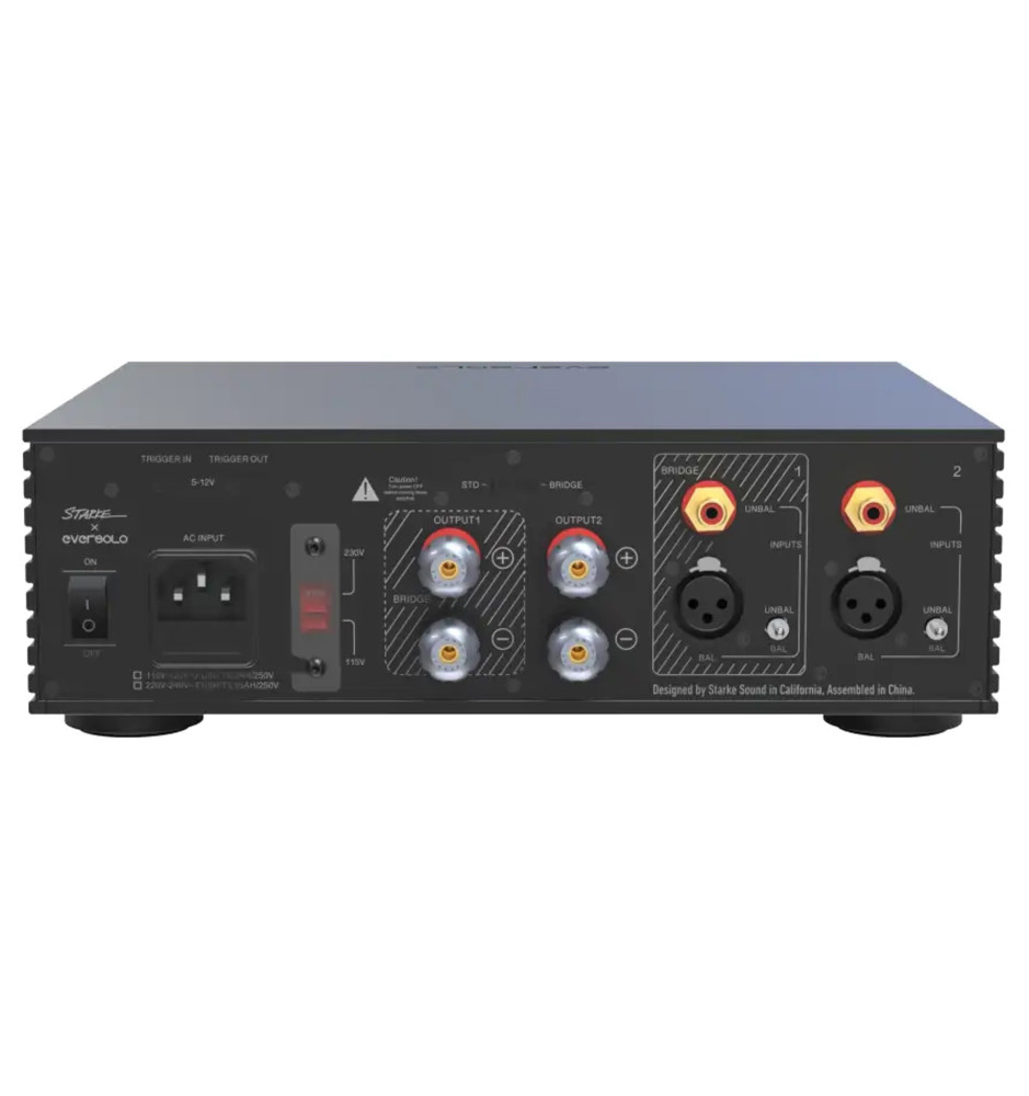 EverSolo AMP-F2 to opracowana we współpracy EverSolo i Starke Sound, bazująca na innowacyjnym module NS600 końcówka mocy pracująca w klasie D, oferująca częstotliwość próbkowania do 600 kHz oraz zmniejszone szumy i zwiększoną dynamikę dzięki dostosowanemu do zastosowań audio zasilaczowi SAPS. AMP-F2 może być zmostkowany, umożliwiając konfigurację 2-kanałową lub mono w zależności od potrzeby. Aluminiowa obudowa wzmacniacza zapewnia skuteczne ekranowanie oraz chroni przed zakłóceniami zewnętrznymi niezależnie od otoczenia.