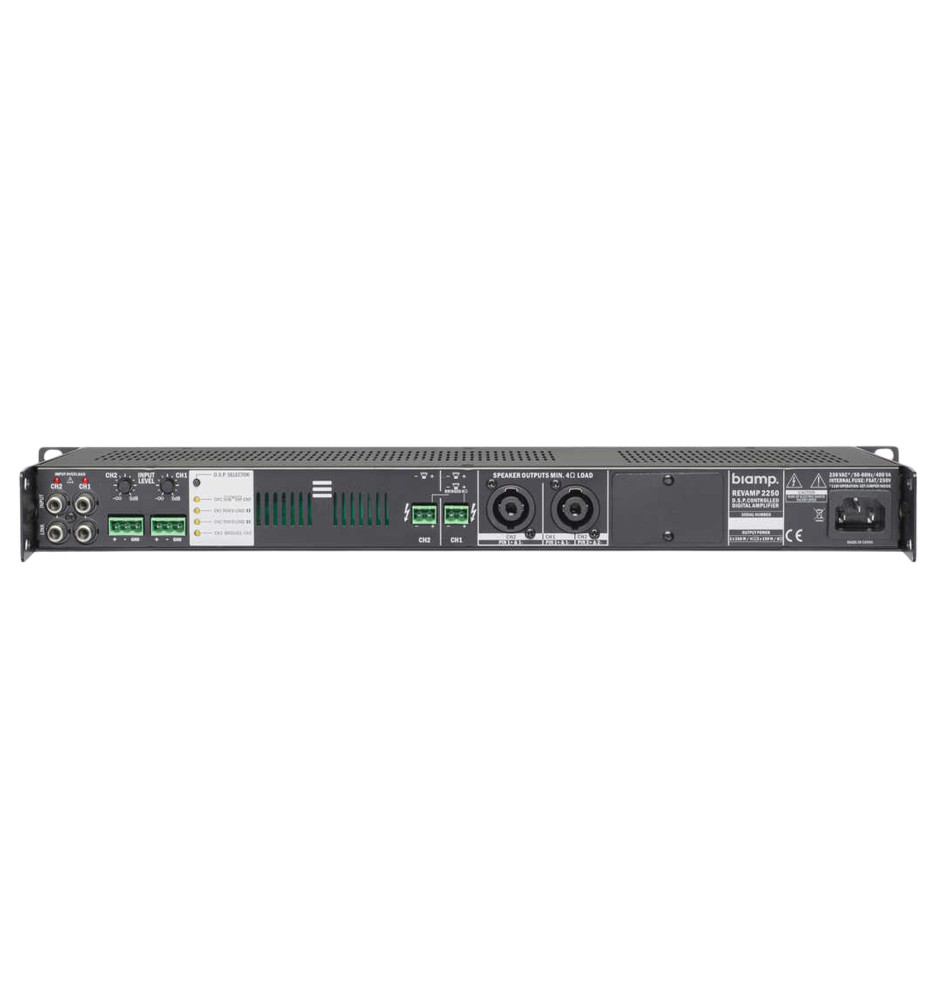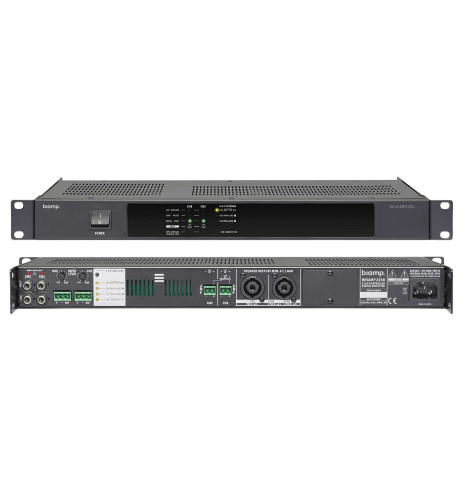 Biamp REVAMP2150 posiada 2 kanały o mocy wyjściowej 2x 250W oraz 4 Ohm z możliwością mostkowania do pojedynczego kanału, w celu uzyskania wzmacniacza o mocy 1x 500W oraz 8 Ohm.