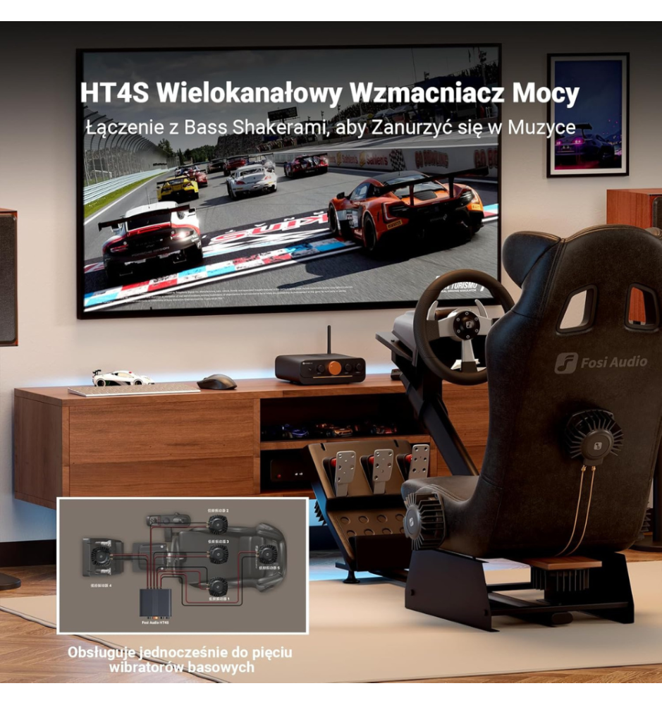 Fosi Audio HT4S to kompaktowy wzmacniacz 5.0/4.1 z wbudowanym DAC, Bluetooth, mocą do 50W na kanał, trybem SUB/CEN i pilotem, idealny do kina domowego i sim racingu.
