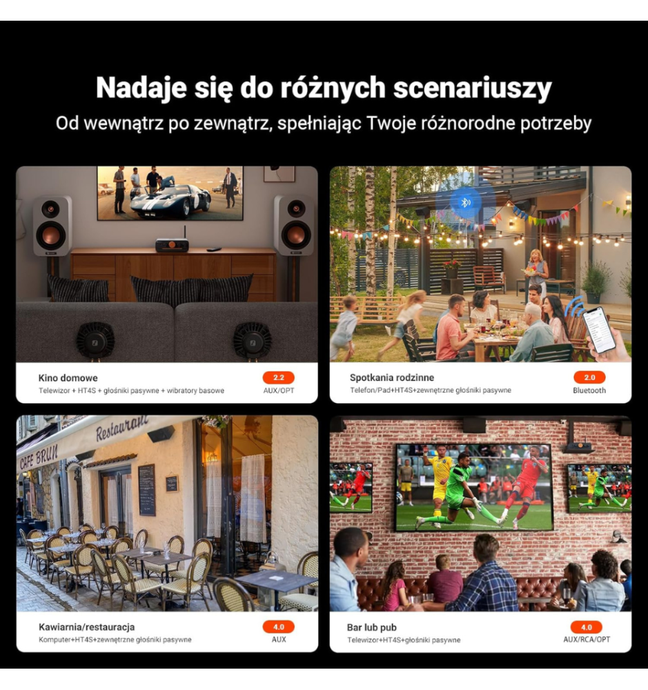 Dzięki kompaktowej budowie i możliwości napędzenia do pięciu głośników, HT4S świetnie sprawdzi się na tarasach, w kawiarniach, barach czy w instalacjach kina domowego. W połączeniu z bass shakerami oferuje znaczące wzmocnienie immersji w grach wyścigowych i filmach — poczujesz nie tylko dźwięk, ale i jego fizyczny wpływ.