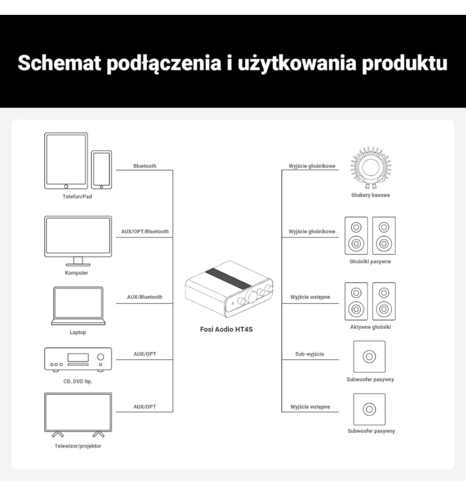 HT4S oferuje (Bluetooth, 3.5 mm AUX i wejście optyczne) oraz wyjścia: 3.5 mm pre-out i wyjścia na pasywne głośniki plus subwoofer. Takie zestawienie umożliwia szybkie podłączenie smartfona, odtwarzacza cyfrowego lub telewizora i integrację z różnymi systemami audio.