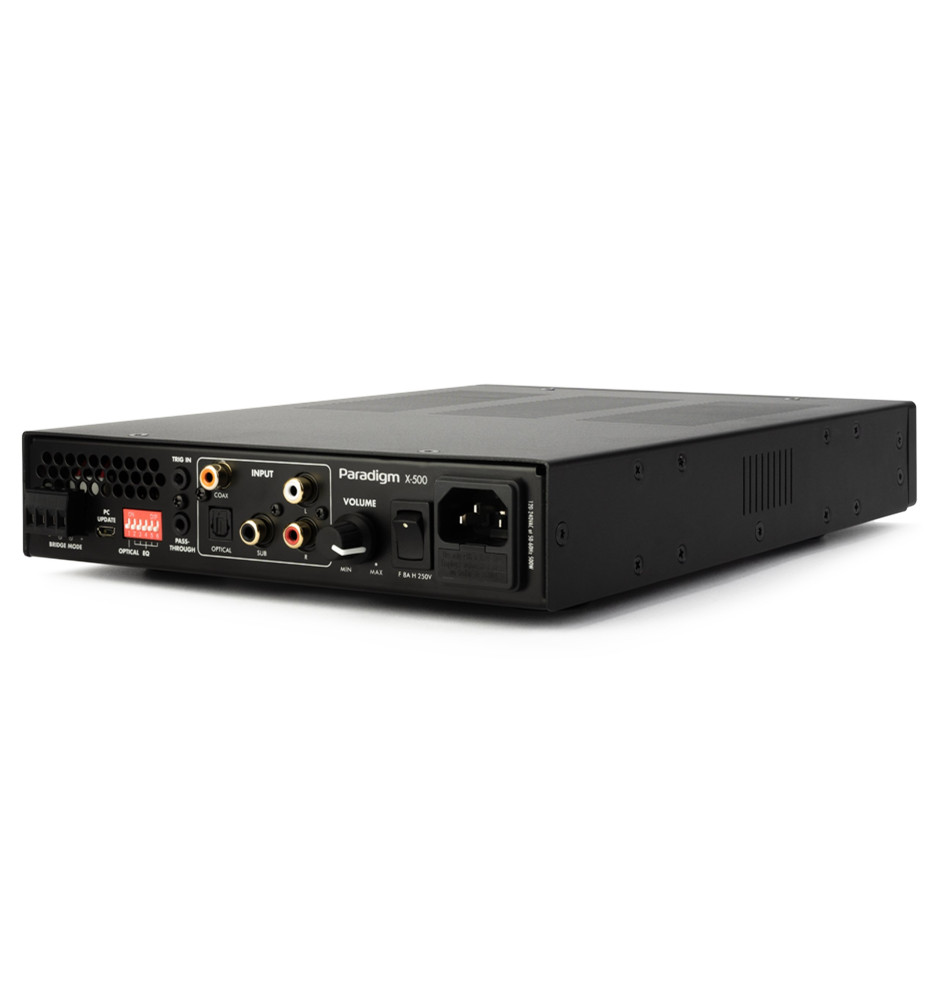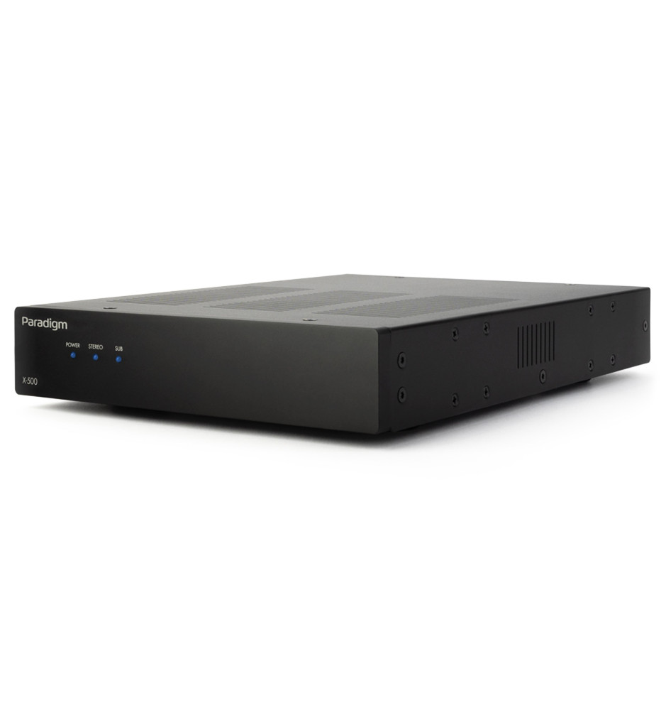 Potężny wzmacniacz instalacyjny o uniwersalnym zastosowaniu i kompaktowych wymiarach, konfigurowalny jako jednokanałowy wzmacniacz mono lub dwukanałowy wzmacniacz stereo. Jest łatwy w instalacji i konfiguracji, oraz oferuje szeroki wybór złącz wejściowych i wybieralny procesor DSP. Paradigm X-500 posiada obudowę o wysokości 1U oraz dołączone uchwyty montażowe, dzięki czemu może być zamontowany w szafie Rack. Jego dynamiczny i cichy układ chłodzenia gwarantuje długą pracę wzmacniacza bez ryzyka przegrzania.