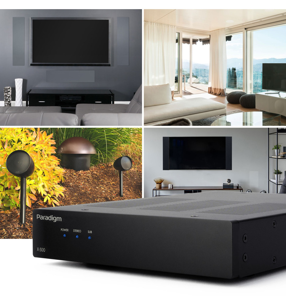 Smukły wzmacniacz Paradigm X-500 stanowi doskonałe uzupełnienie dla głośników ściennych i sufitowych z serii Paradigm Home, Pro i Elite, pasywnych subwooferów Defiance Custom oraz głośników ogrodowych i zewnętrznych Stylus, Rock i Garden Oasis. Może pracować jako dwukanałowy wzmacniacz stereo, podwójny mono lub zmostkowany jednokanałowy mono.