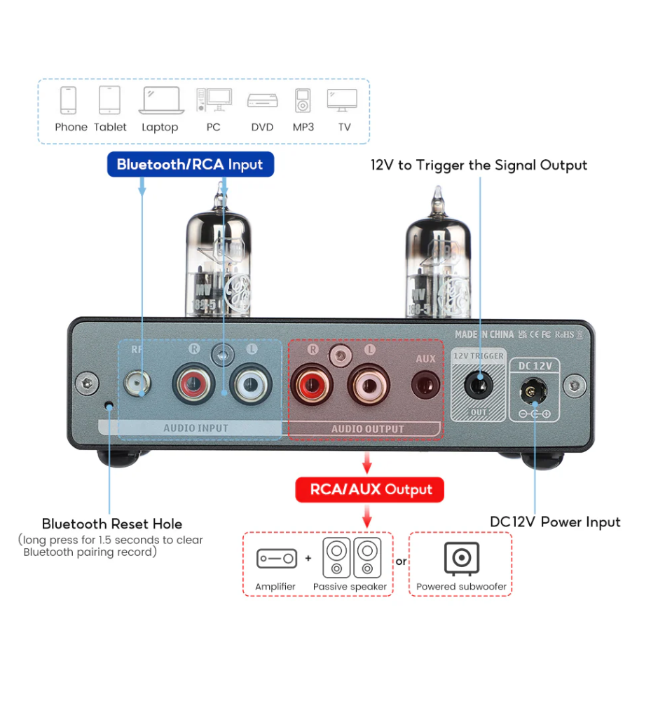 Przedwzmacniacz obsługuje wejścia RCA i Bluetooth, współpracując ze smartfonami, tabletami, komputerami, odtwarzaczami MP3 czy telewizorami. To uniwersalne rozwiązanie do różnych źródeł dźwięku i zastosowań.