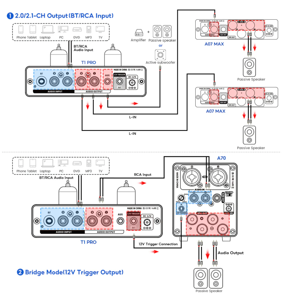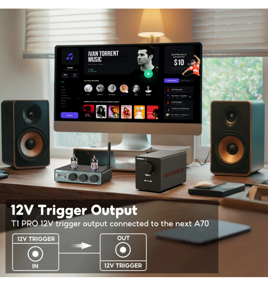 AIYIMA T1 PRO współpracuje zarówno z aktywnymi głośnikami, jak i zestawami opartymi na wzmacniaczu i kolumnach pasywnych. Dostępne jest także wyjście na aktywny subwoofer, co umożliwia budowę systemu dostosowanego do indywidualnych potrzeb.