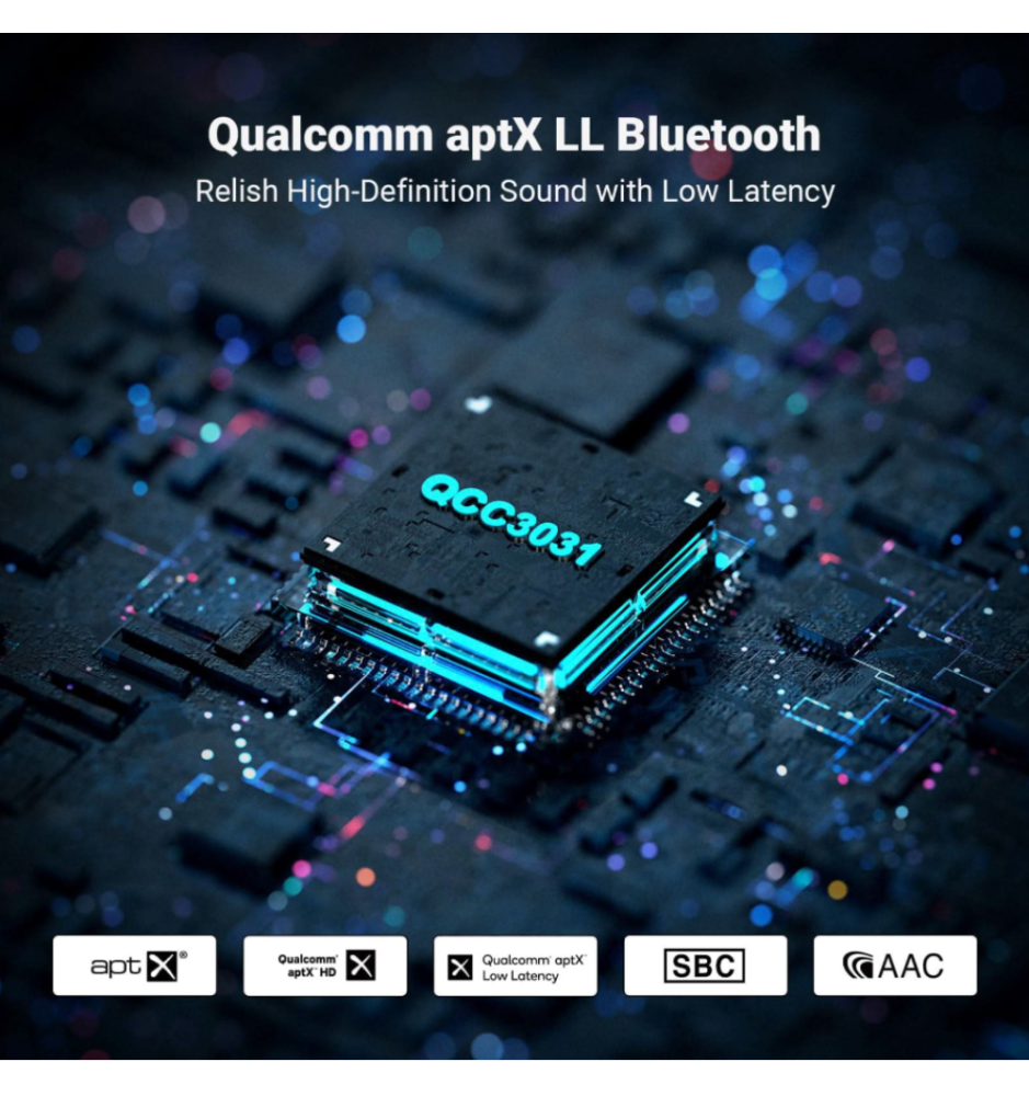 Wbudowany układ Qualcomm QCC3031 zapewnia stabilne połączenie bezprzewodowe z niskimi opóźnieniami. Obsługa kodeków SBC/AAC/aptX/aptX HD/aptX LL gwarantuje wysoką jakość transmisji audio i minimalne przesunięcie dźwięku przy filmach i grach.