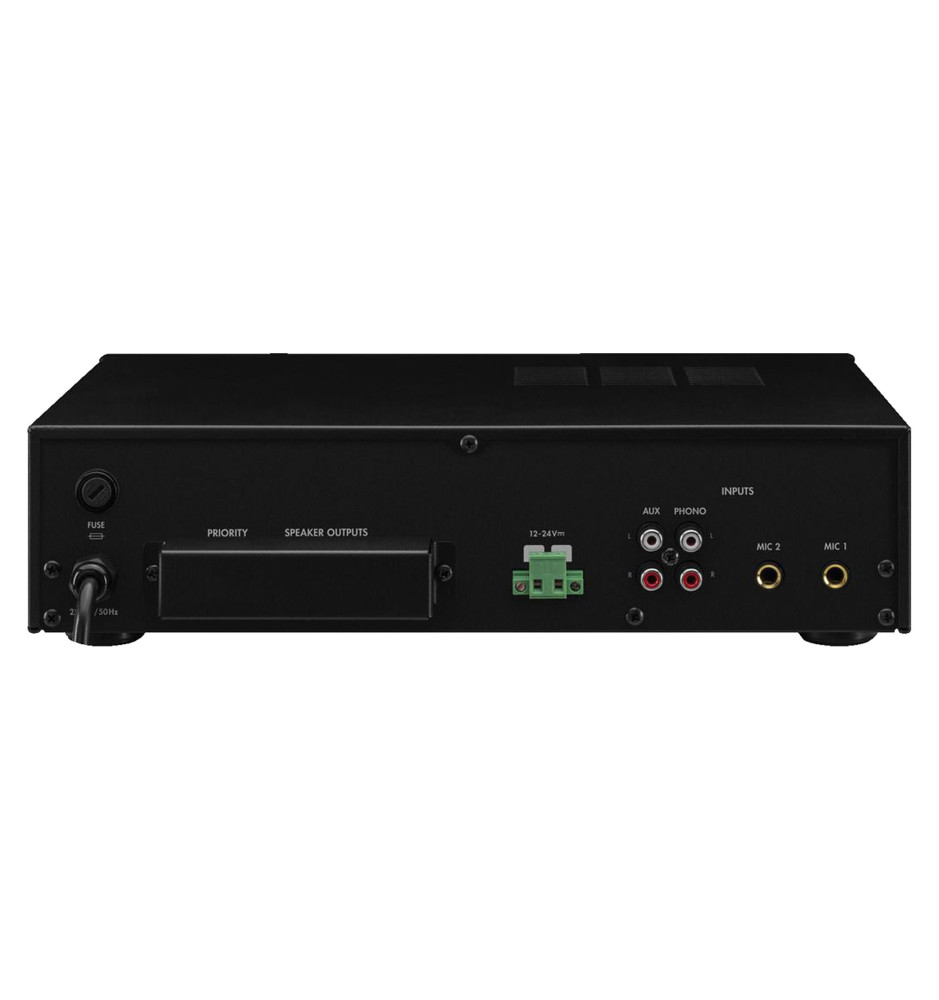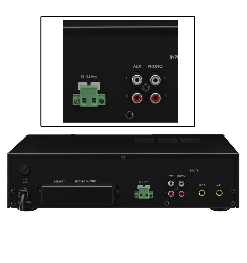 Wzmacniacz został zaprojektowany w taki sposób aby zapewnić możliwość podłączenia niezbędnych do pracy urządzeń. Złącza które znalazły się to: 2 x 6.3 mm (mic), 1 x RCA L/R (aux), 1 x RCA L/R (phono), terminale śrubowe (głośniki).