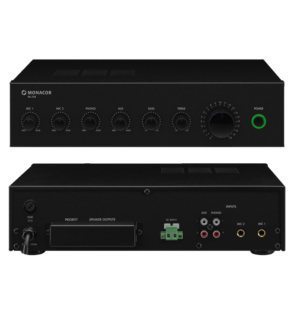 Profesjonalny wzmacniacz miksujący PA-704, mający szerokie zastosowanie w systemach PA o mocy RMS 35W. Posiada szereg bardzo ważnych użytkowych wejść takich jak : 5 mV (mic), 210 mV (aux), 5 mV (phono). Ponadto charakteryzuje się on bardzo cichą pracą dzięki zastosowaniu chłodzenia bez wentylatora. Idealny stosunek ceny do jakości.