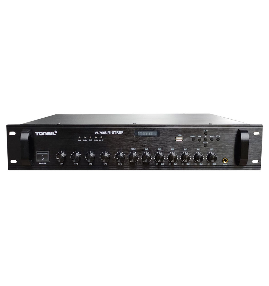 Zaawansowany 5-strefowy wzmacniacz miksujący o mocy 700W z niezależną regulacją każdej ze stref nagłośnieniowych, łącznością Bluetooth, radiem FM, slotem kart pamięci SD oraz odtwarzaczem MP3 z nośników USB. Tonsil W-700U posiada również trzy wejścia mikrofonowe oraz dwa wejścia liniowe AUX do podłączenia źródeł dźwięku.