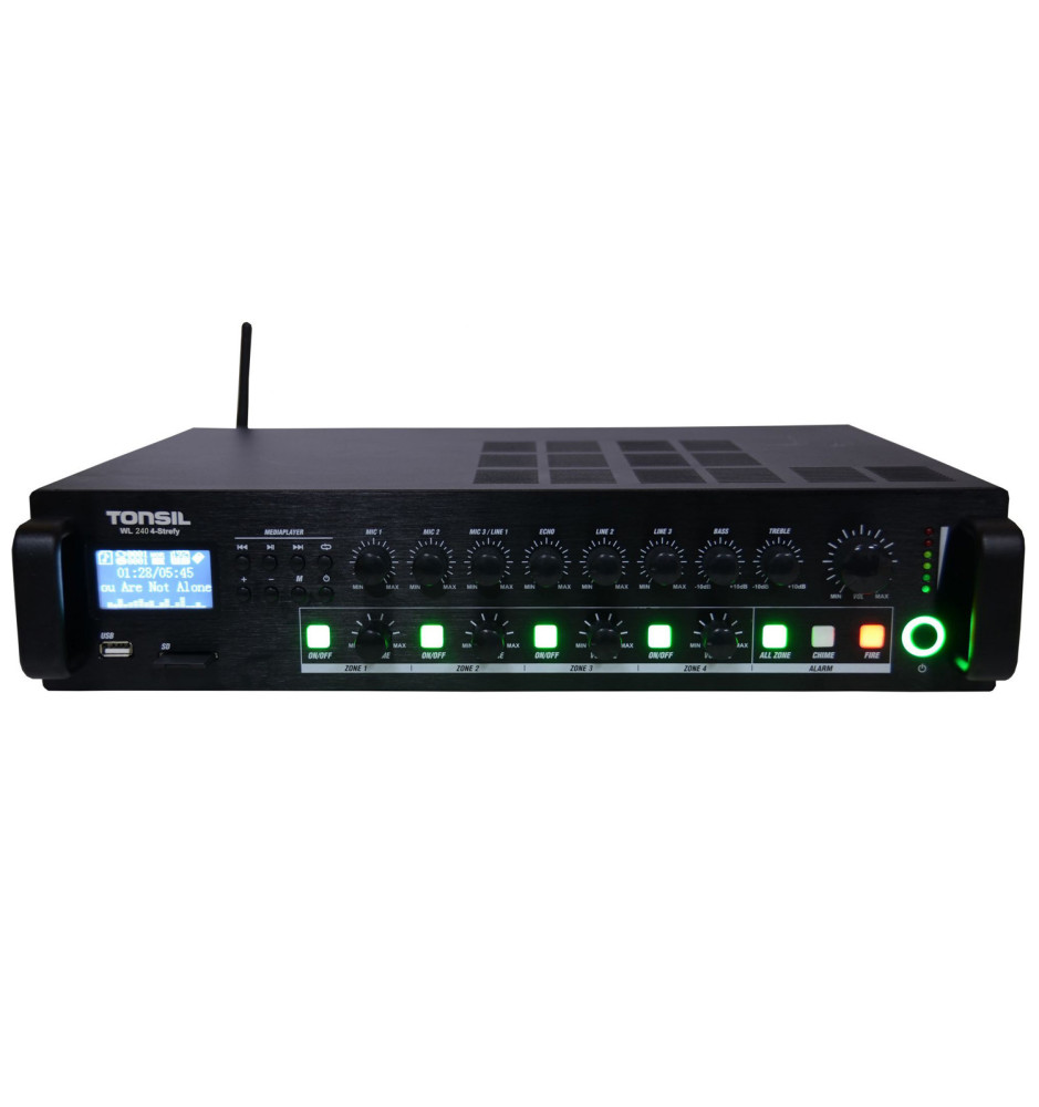 Tonsil WL-240 to 4-strefowy wzmacniacz miksujący o mocy 240W. Posiada możliwość sterowania każdą ze stref i jest wyposażony w odtwarzacz MP3, technologię Bluetooth, tuner FM, port USB oraz slot kart pamięci SD.