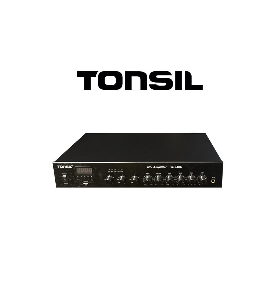 Wzmacniacz miksujący Tonsil W-240U to 3-strefowy wzmacniacz miksujący z możliwością sterowania każdą ze stref, wyposażony w odtwarzacz MP3, technologię Bluetooth, radio FM oraz wejście USB.