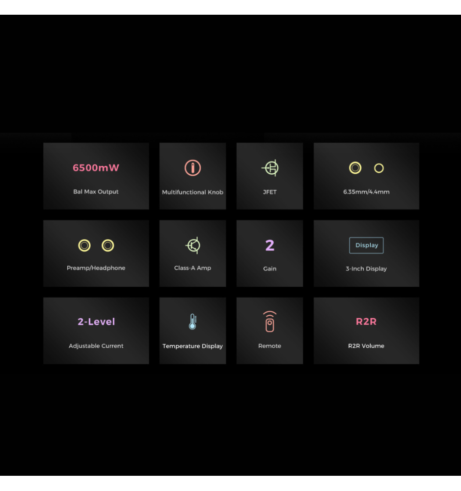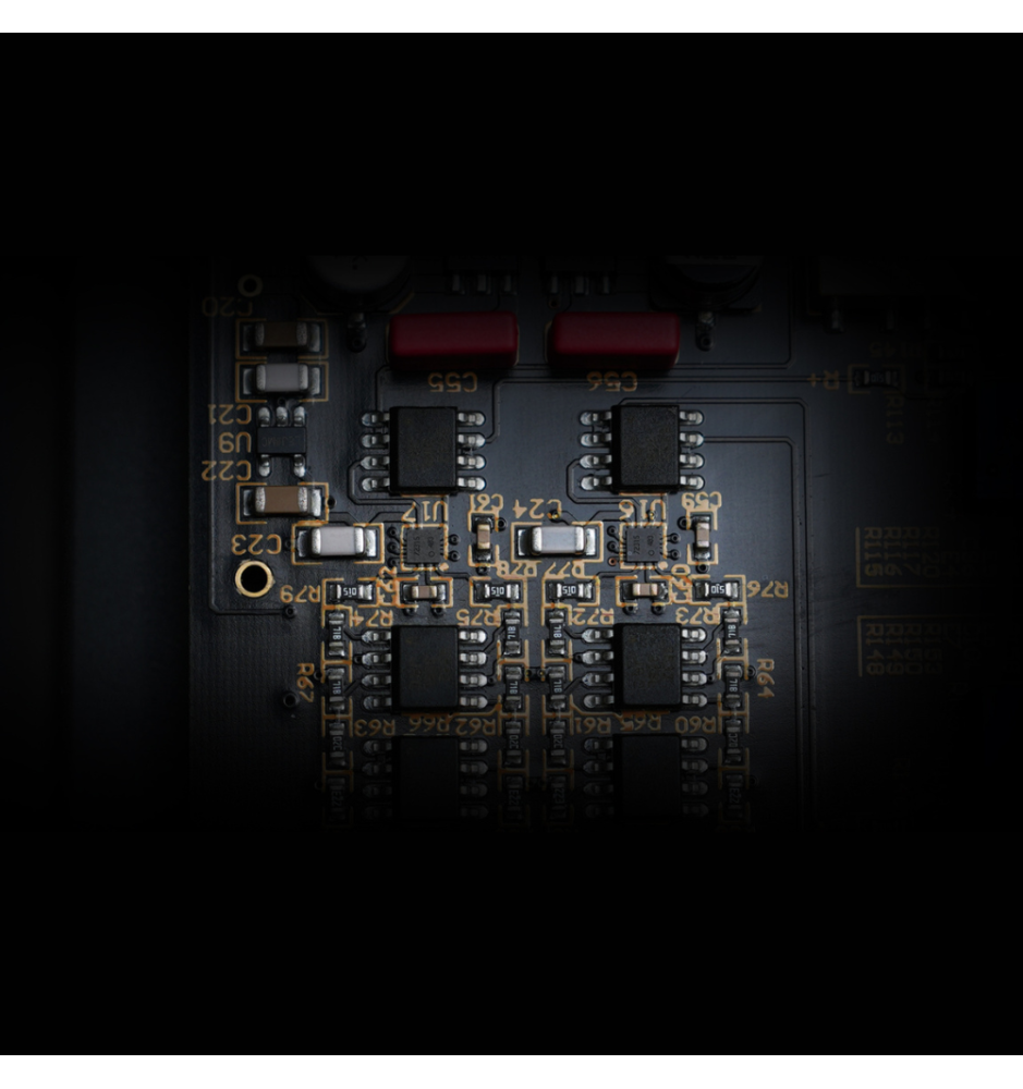 Podwójne układy R2R od JRC współpracują z dedykowanymi wzmacniaczami operacyjnymi, tworząc 4-kanałową regulację głośności z doskonałym balansem kanałów i szeroką sceną dźwiękową. Dwa stopnie wzmocnienia pozwalają pracować z niskim poziomem dla IEM (ultra-niski szum) oraz wysokim poziomem dostarczającym nawet 6,5 W mocy — wystarczająco, by napędzić wymagające słuchawki.