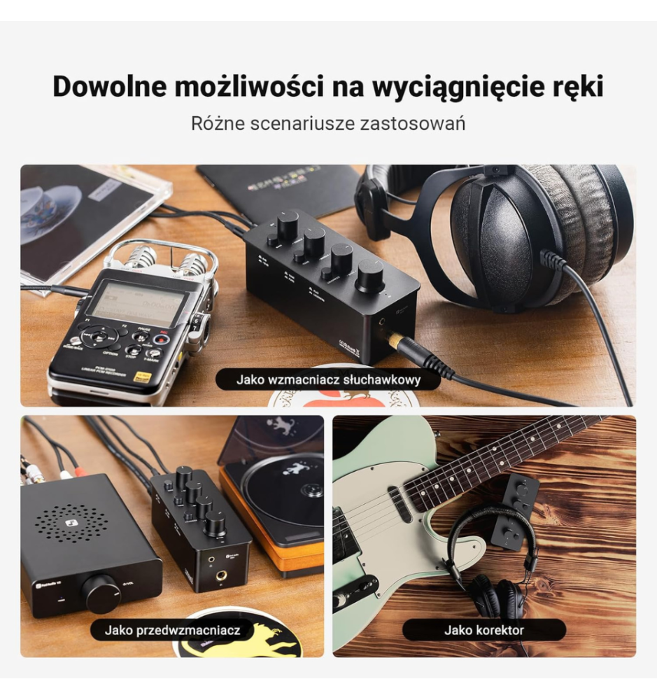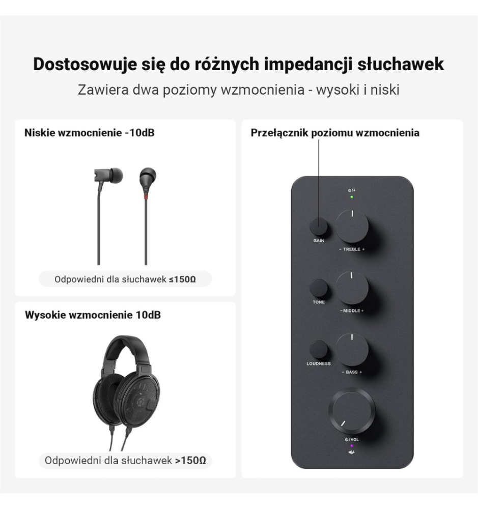 Wzmacniacz wyposażono w wejście 3.5 mm line-in oraz wyjścia: 3.5 mm i 6.35 mm dla słuchawek, a także 3.5 mm line-out. Wysoka wydajność – nawet 2400 mW RMS przy 32 Ω (tryb High Gain) – zapewnia obsługę słuchawek o impedancji 16–300 Ω i pełnię dynamiki niezależnie od modelu.