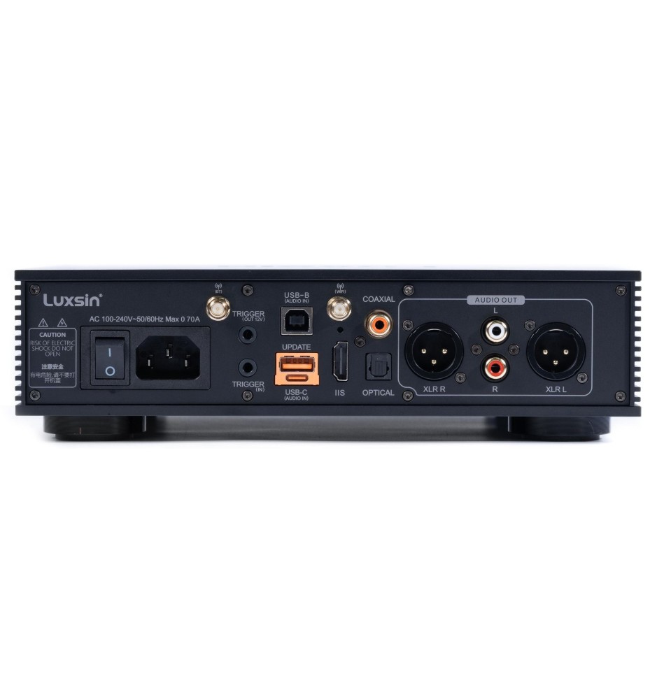 Luxsin X8 oferuje szeroki zestaw złączy cyfrowych, w tym USB-B, USB-C, optyczne, koaksjalne oraz IIS, co umożliwia współpracę z wieloma źródłami dźwięku. Do dyspozycji użytkownika są także wyjścia analogowe RCA i zbalansowane XLR, a także wyjścia słuchawkowe 6.35 mm, 4.4 mm oraz 4-pin XLR. Złącza 12V Trigger pozwalają na łatwą integrację z większym systemem audio i automatyczne sterowanie innymi urządzeniami.