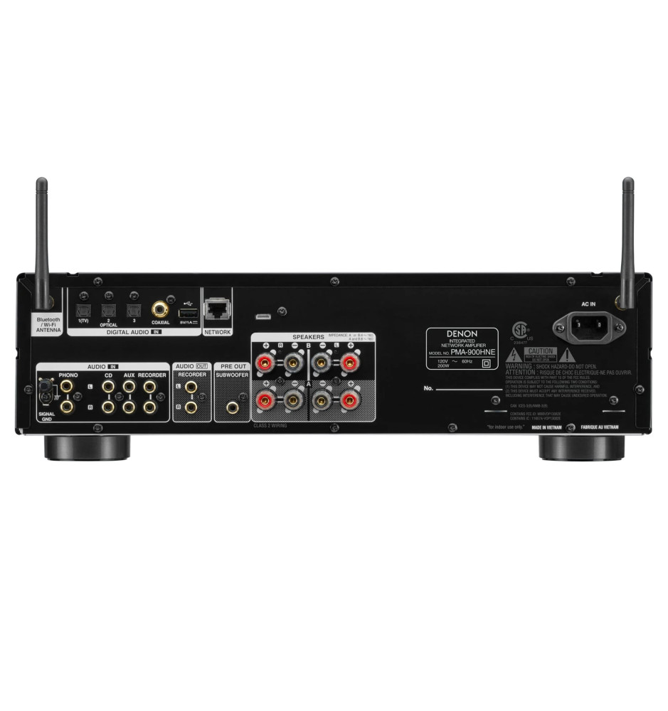 PMA-900HNE wyposażony jest w trzy wejścia optyczne, jedno koaksjalne oraz port USB-A, umożliwiając podłączenie wielu urządzeń. Łączność Wi-Fi, LAN oraz wsparcie dla Bluetooth, AirPlay 2 oraz platformy HEOS pozwala na bezprzewodowe odtwarzanie muzyki z popularnych serwisów streamingowych, takich jak Spotify, Tidal czy SoundCloud.