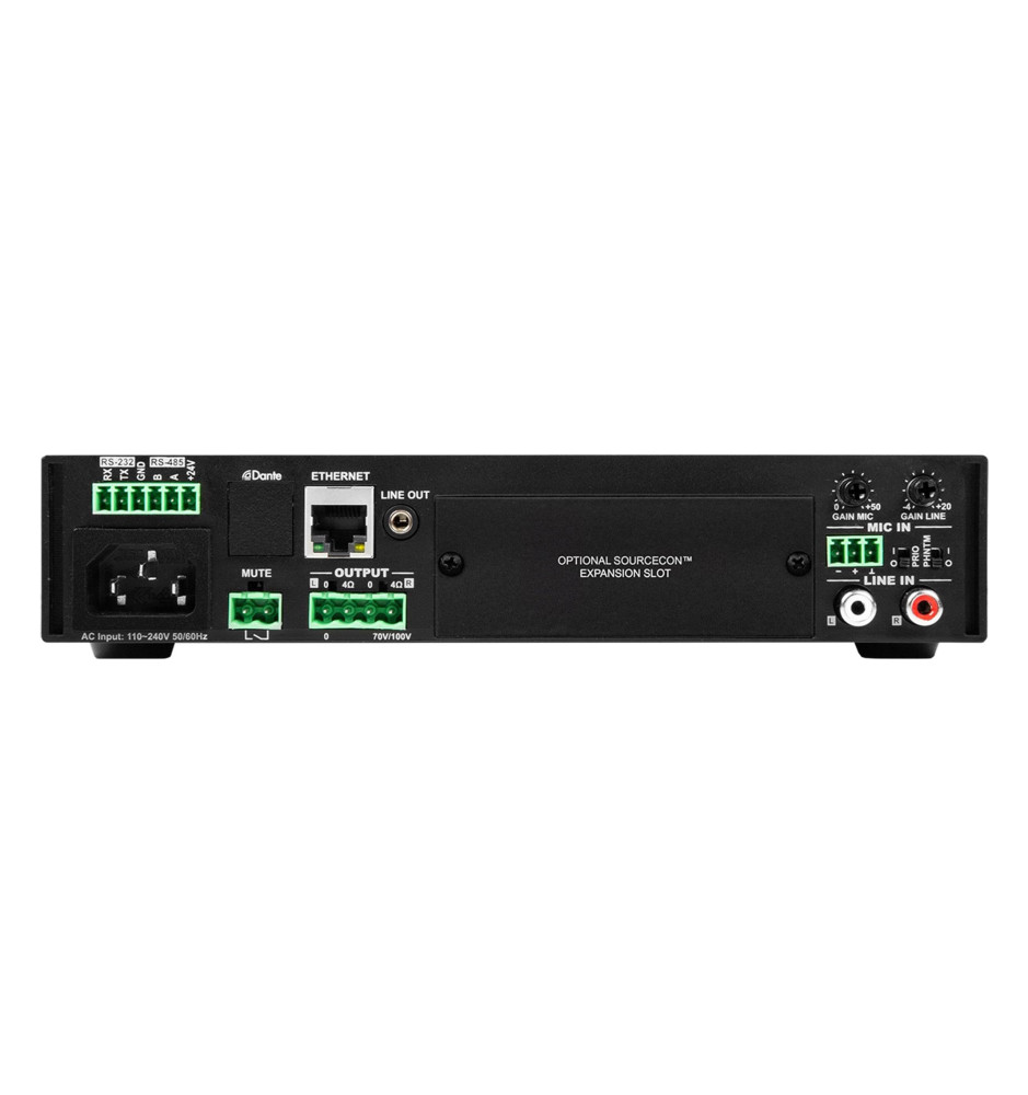 Symetryczne wejście mikrofonowe/liniowe pozwala podłączyć do niego mikrofon pagingowy wykorzystywany do komunikatów głosowych. Może to być również mikrofon pojemnościowy wykorzystujący wbudowany zasilacz w standardzie Phantom 15 V. W razie zaistnienia potrzeby wygłoszenia komunikatu lub jego odtworzenia z pliku wzmacniacz posiada przełącznik sygnału priorytetowego, który wycisza aktualnie odtwarzaną muzykę w tle.