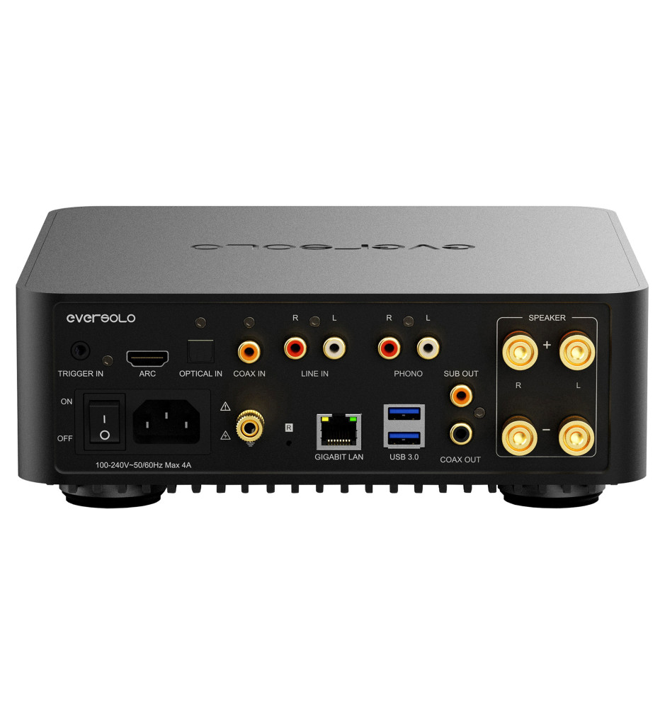 W sercu EverSolo Play CD Edition znajduje się 32-bitowy DAC AKM AK4493SEQ z technologią VELVETSOUND™, zapewniający czysty, naturalny dźwięk. Wzmacniacz klasy D oferuje moc 2 x 60 W przy 8 Ohm lub 2 x 110 W przy 4 Ohm i niskie zniekształcenia THD+N <0,0037%. Całość zamknięto w eleganckiej, frezowanej obudowie z aluminium z radiatorem chłodzącym.
