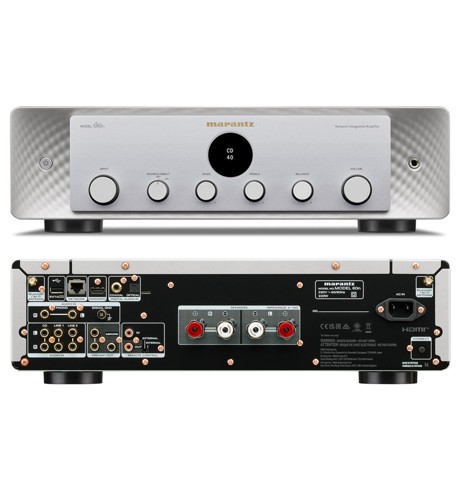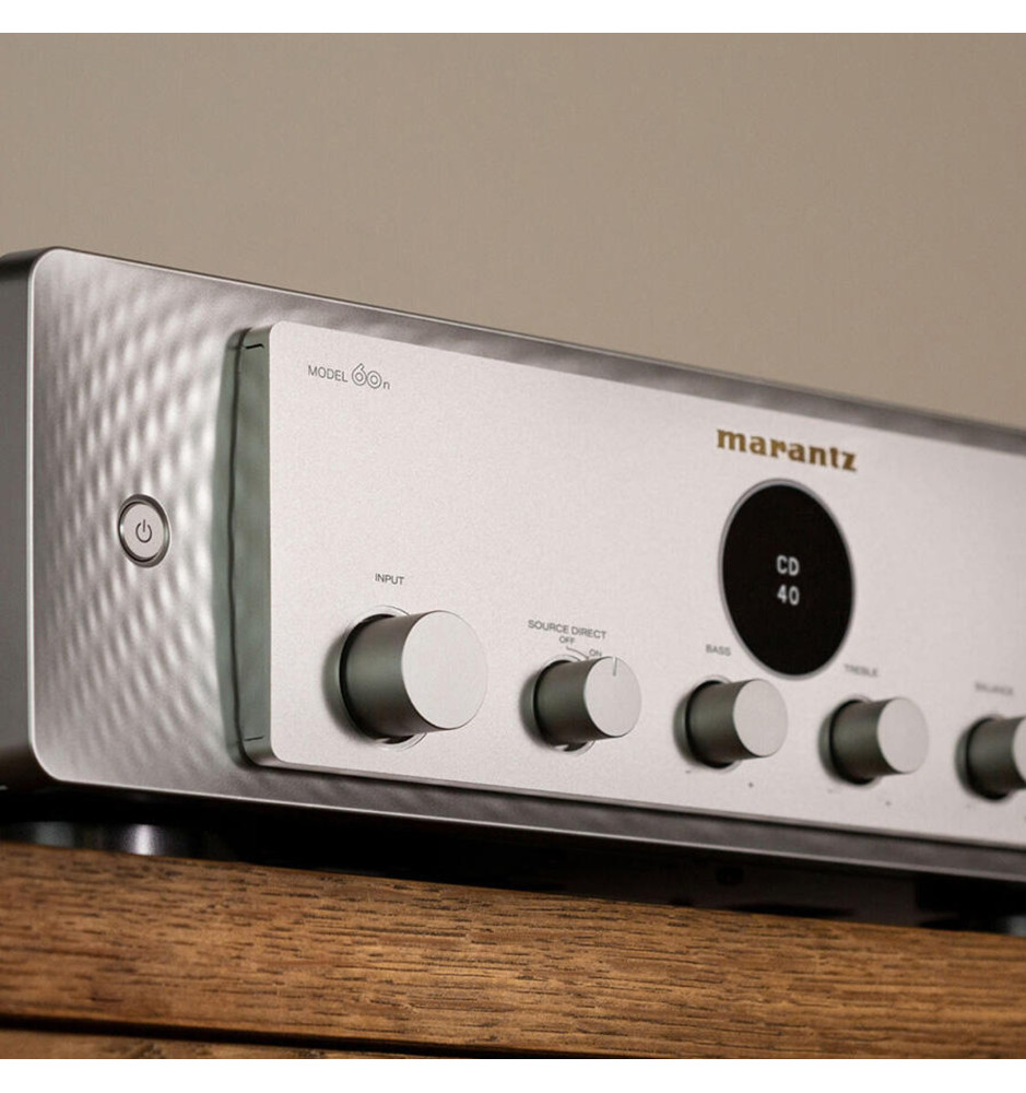 Model 60n oferuje wyjątkową jakość dźwięku, dzięki zastosowaniu najwyższej klasy komponentów oraz technologii. Wspiera formaty o wysokiej rozdzielczości, co zapewnia niezrównane brzmienie nawet przy najbardziej wymagających nagraniach. Został starannie dostrojony przez specjalistów Marantz Sound Master, aby zapewnić czysty, wielowarstwowy i bogaty dźwięk, charakterystyczny dla produktów Marantz.