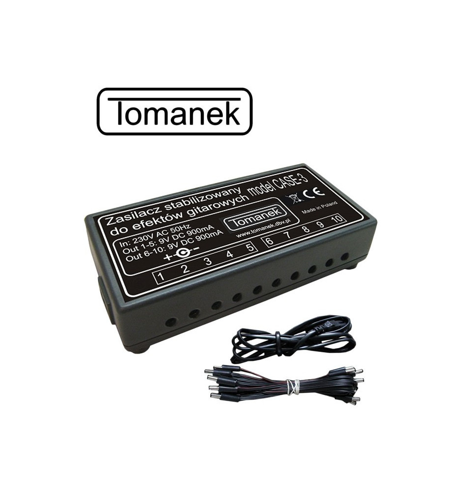 Wysokiej jakości stabilizowany zasilacz Tomanek CASE-3 z możliwością podłączenie do 10 efektów gitarowych cechuje się dwiema odseparowanymi sekcjami oraz filtrem pojemnościowym i zabezpieczeniami przeciwpożarowymi oraz termicznymi.