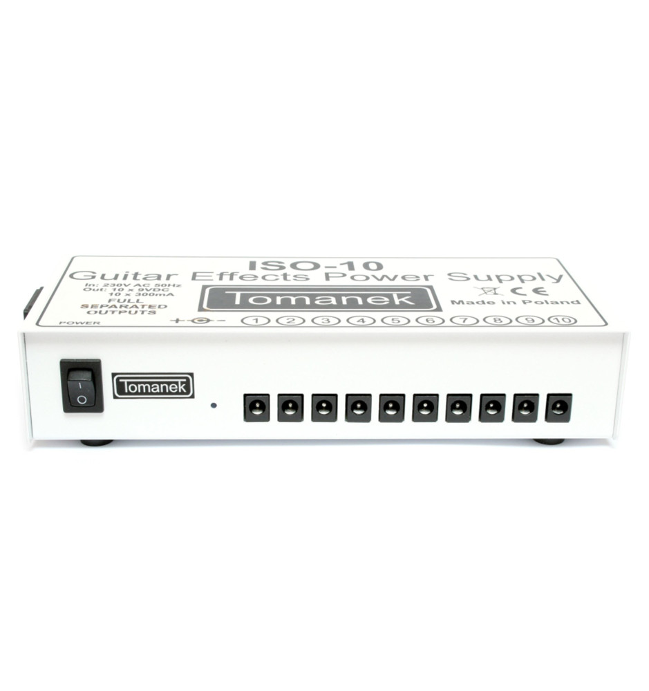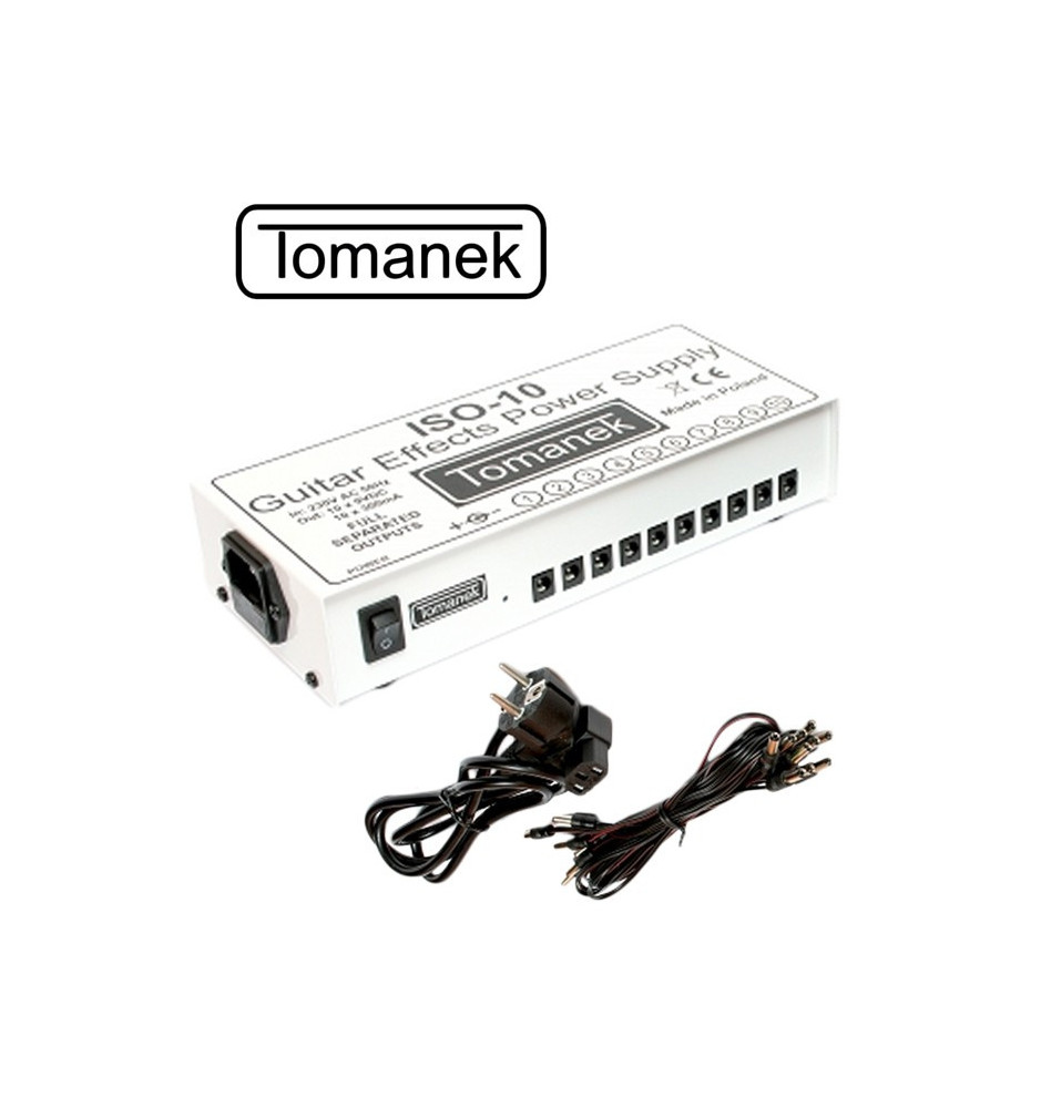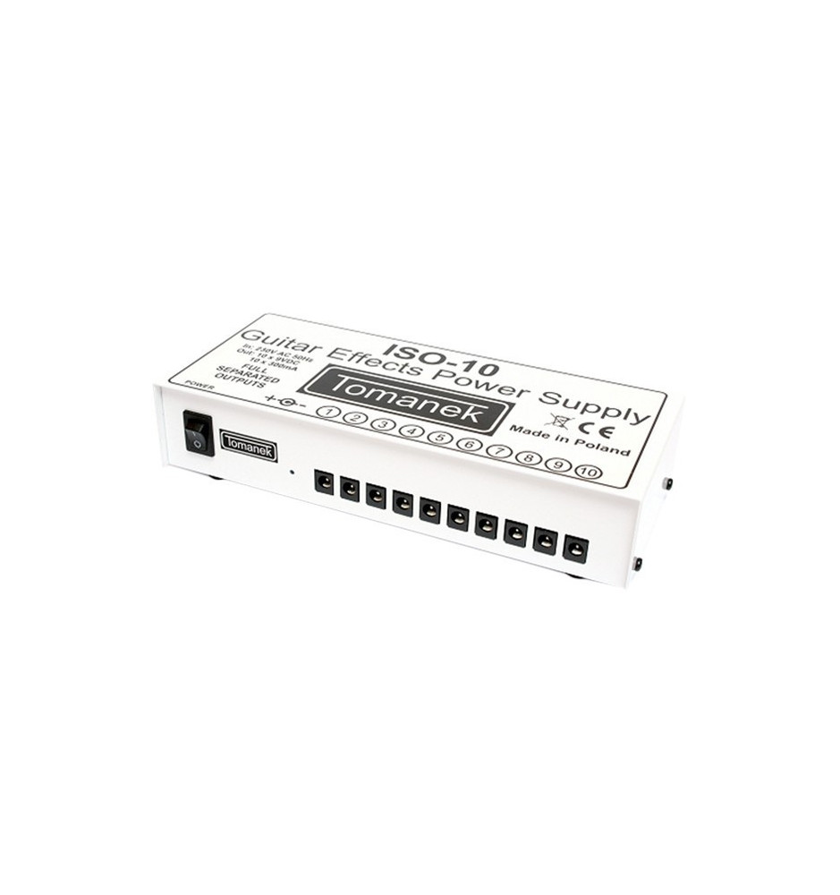 Zasilacz Tomanek ISO-10 umożliwia zasilenie do 10 efektów gitarowych (do 300mA na wyjście), jednak bez konieczności używania wszystkich wyjść. Filtry pojemnościowe chronią efekty przed ewentualnymi zakłóceniami, natomiast zabezpieczenie przeciwzwarciowe oraz termiczne oddzielne dla każdego wyjścia, zabezpiecza urządzenie przed niepożądanym zwarciem lub przegrzaniem sprzętu.