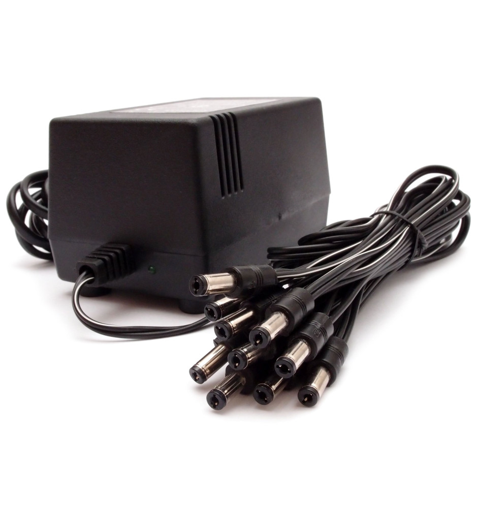 Zasilacz do efektów gitarowych, wyposażony w transformator toroidalny ze stabilizatorem napięcia oraz 10 wtykami do efektów, zapewniający najwyższej jakości stałe napięcie 9V.