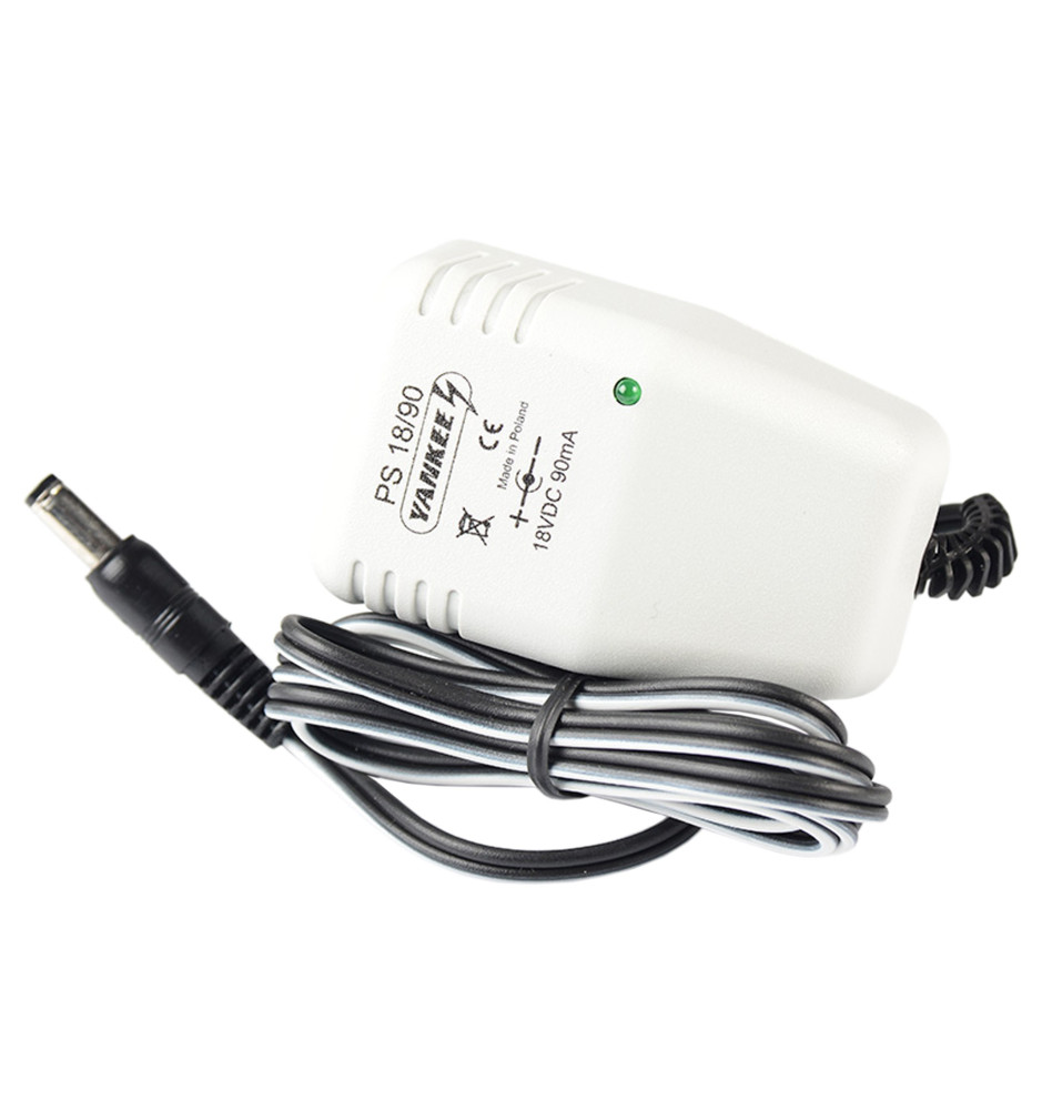 Wyprodukowany w Polsce, profesjonalny stabilizowany zasilacz 18V DC 90mA do efektów gitarowych, wyposażony w pojedynczy prosty wtyk, kompatybilny z efektami większości popularnych producentów.
